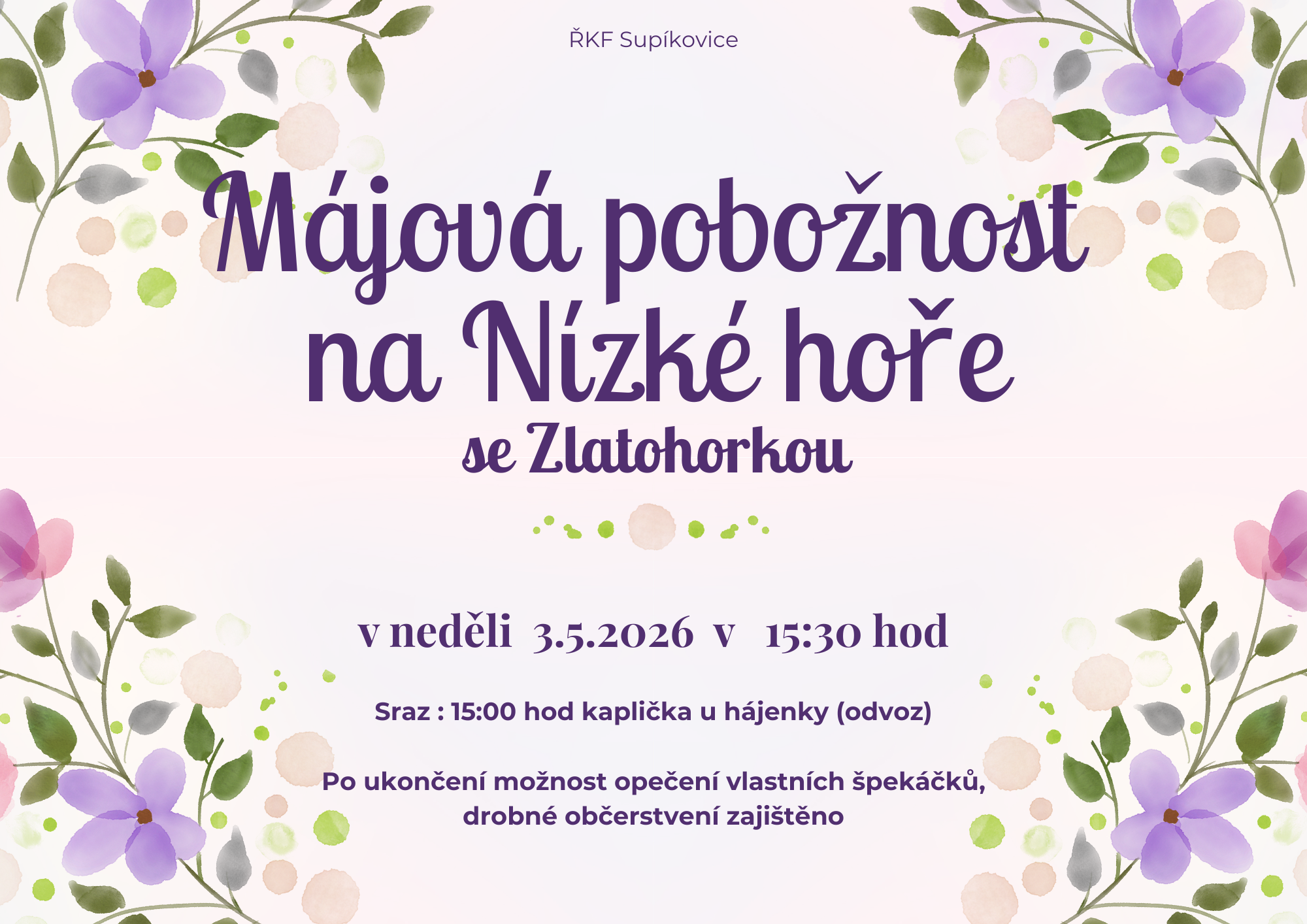 Římskokatolická farnost Supíkovice zve na Májovou pobožnost na Nízké hoře se Zlatohorkou Kdy: neděle 3. května 2026 v 15:30 hodin Sraz: 15:00 hodin, kaplička u hájenky Více na plakátu Akce je součástí Děkanátních květnových pobožnostech, protože květen je zasvěcen Panně Marii, odkaz na ostatní pobožnosti najdete zde: https://www.dekanatjesenik.cz